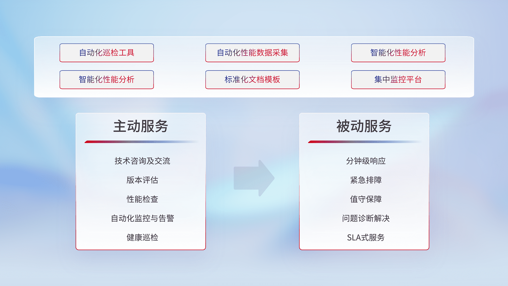 智能化工具和标准化文档,,,保障服务质量,,提供主动服务(包含技术咨询、、版本评估、、、、性能检查、、、自动化监控与告警、、、、健康巡检)和被动服务包含(分钟级响应、、紧急排障、、、值守保障、、、问题诊断解决、、、SLA服务)。。。